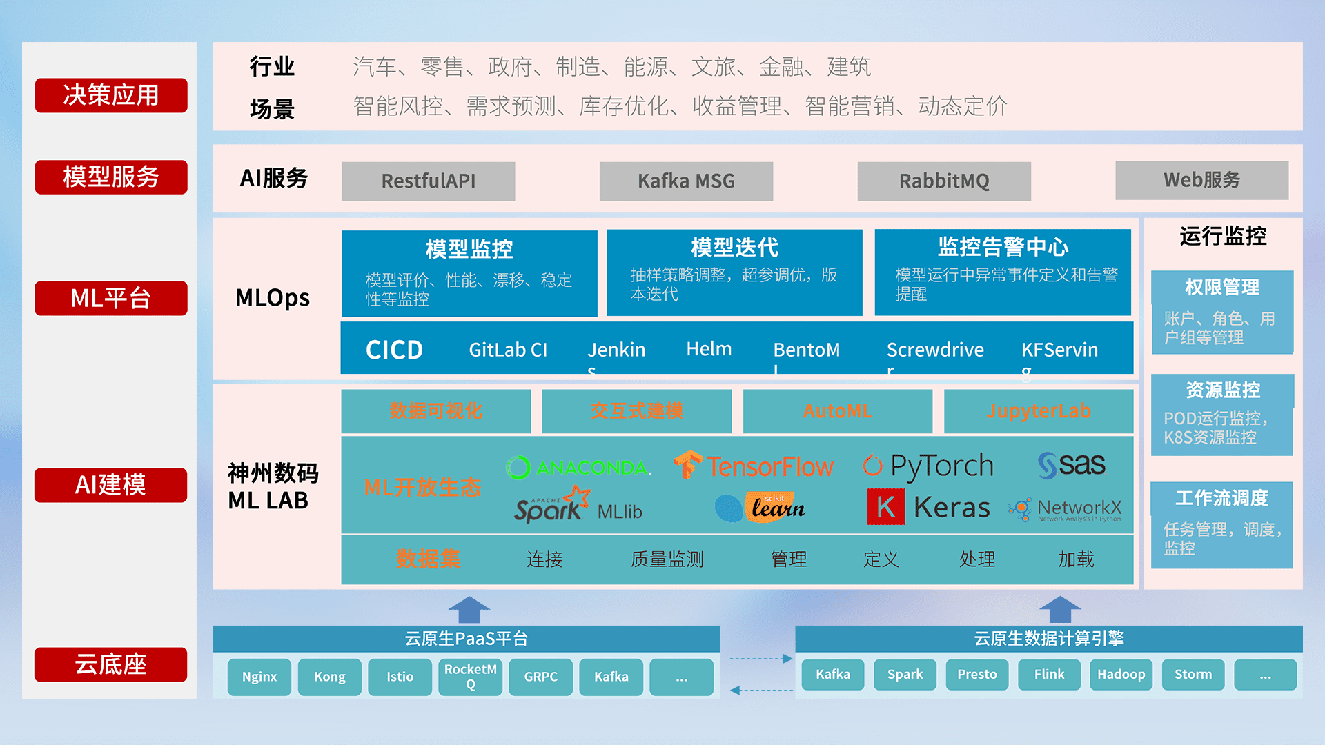 数据+模型双引擎驱动,,面向智能服务场景,,快速灵活利用AI技术,,,,支持业务决策,,,助力企业智能化转型破局。。